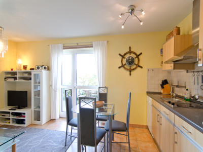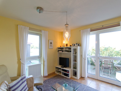 1 Wohn- Essraum mit Couch und Esstisch sowie Sat-TV,