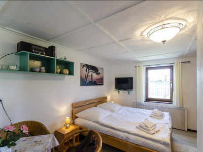 1 kombinierter Wohn- & Schlafraum mit Couch, Doppelbett und Sat-TV