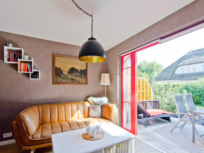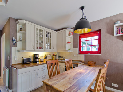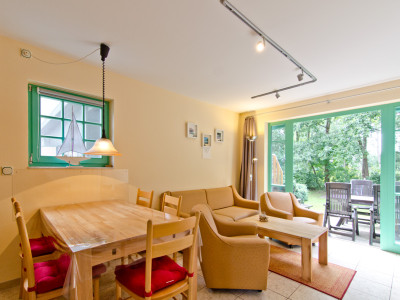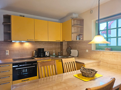 Im Erdgeschoß befindet sich der geräumige Wohn- und Essbereich, die Küchenzeile (mit Geschirrspüler, Mikrowelle) und das Duschbad.