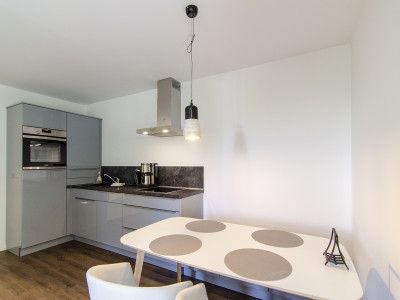 1 offene Küche mit Herd, Kühlschrank, Geschirrspüler, Mikrowelle, Kaffeemaschine, Wasserkocher und Toaster